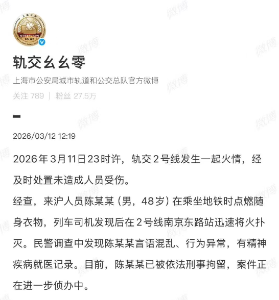 3月12日,上海市公安局城市轨说念和公交总队官方微博发布最新通报: