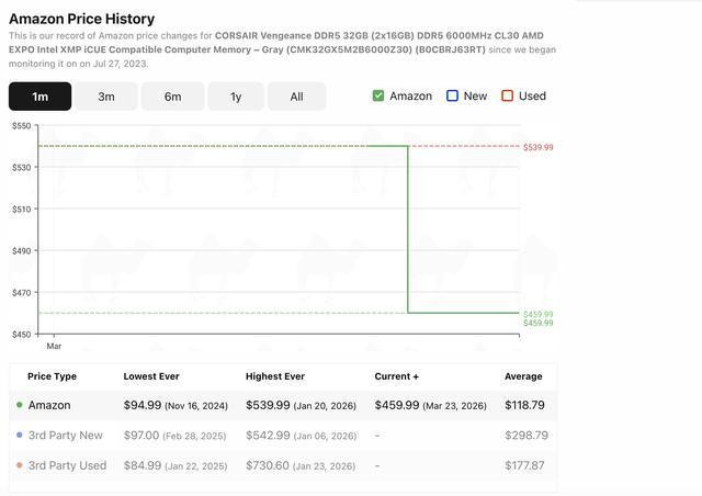 财联社记者于camelcamelcamel平台查询好意思国亚马逊网站上一款海盗船的复仇者(VENGEANCE)系列DDR532GB内存条的价钱发现,该家具在一周前从539.99好意思元降价80好意思元-459.99好意思元。