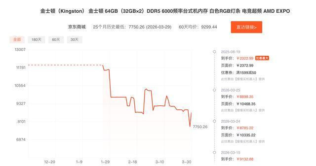 字据冉冉买App,京东商城的一款金士顿64GB(32GB×2)DDR56000频率台式机内存现在售价为7750.26元,而在两个月前,这款家具的价钱为11781元。