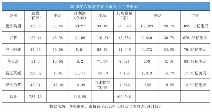 阅历了2025年“外卖大战”,六家新茶饮上市公司(蜜雪集团、古茗、霸王茶姬、茶百说念、沪上大姨、奈雪的茶)呈现出权贵分化的相貌——不单是是事迹,更是本钱市集的证明。