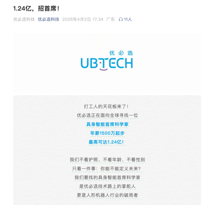 4月2日,优必选科技发布音书称,公司正面向群众招募具身智能首席科学家,年薪1500万元起步,最高可达1.24亿元。