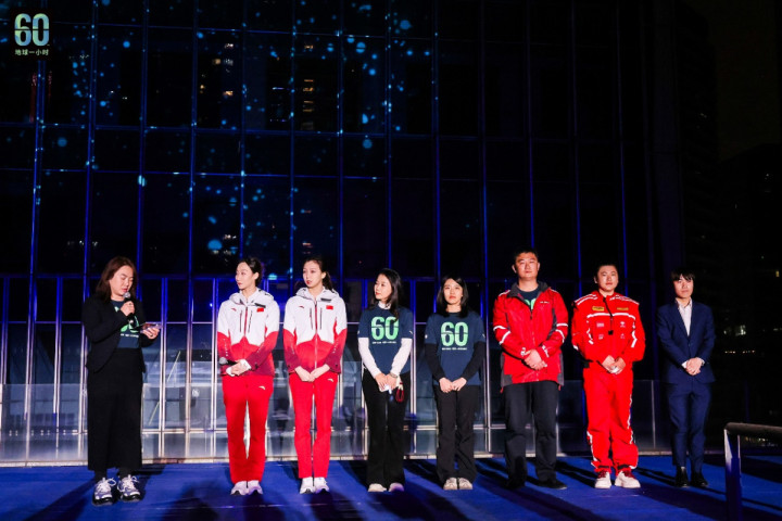 △京东快递员代表魏谐和、秒送骑手代表陈若男手脚志愿者进入北京地球一小时线下活动